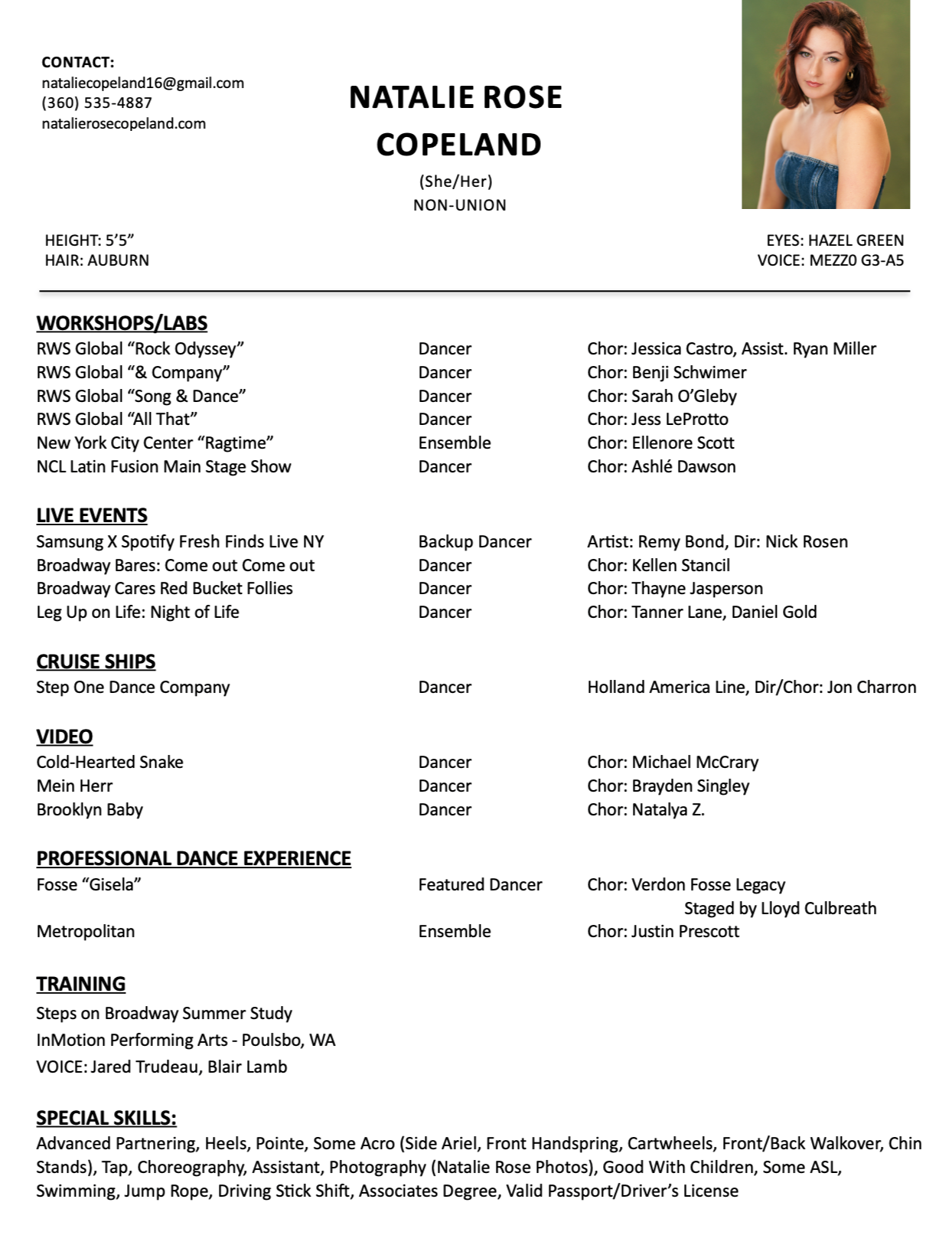 Natalie is a New York City based dancer, singer, and photographer. She is originally from Poulsbo, WA (a town on the peninsula near Seattle) where she grew up with her four younger siblings. She started her career performing with Step One Dance Company onboard Holland America Line. She has worked in both commercial and theatrical fields including projects with Spotify, New York City Center, & RWS Global. She has worked with acclaimed choreographers such as Jessica Castro, Benji Schwimmer, Sarah O’Gleby, Jess LeProtto, and more.